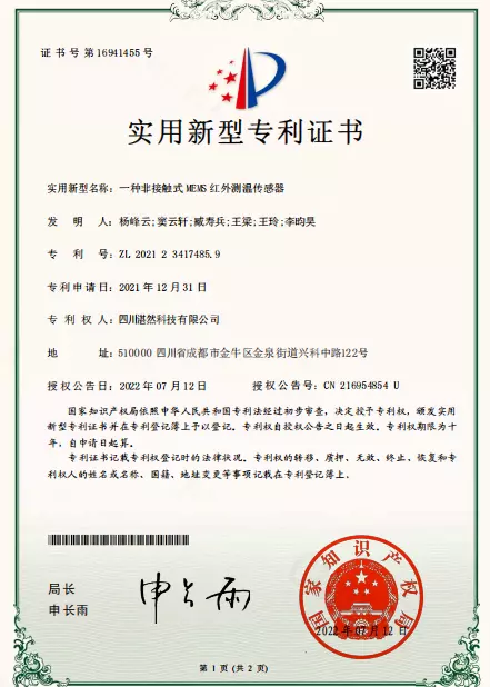 ZR Hi-Tech’s non-contact MEMS infrared temperature sensor has obtained a utility model patent certificate and will continue to focus on producing high-quality products and continuous innovation.