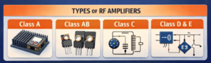 RF power amplifiers are commonly categorized by their operating class, which describes how the transistor conducts current during a signal cycle.