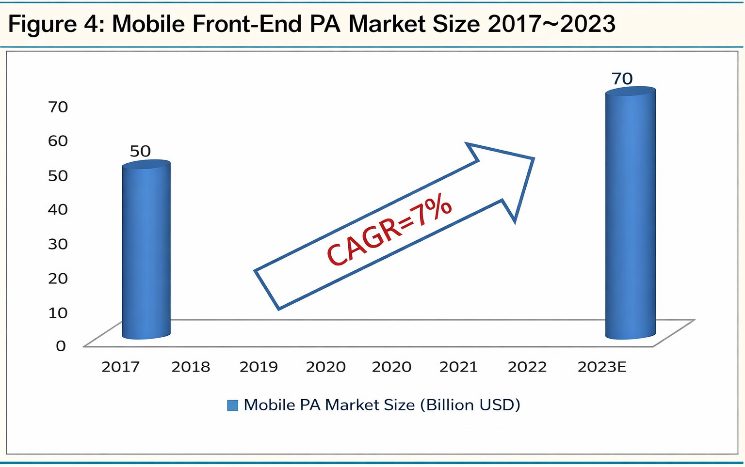 The power amplifier market is growing relatively steadily, with a compound annual growth rate of 7%, rising from $5 billion in 2017 to $7 billion in 2023. The growth of the high-end LTE power amplifier market, especially in the high and ultra-high frequency ranges, will offset the decline in the 2G/3G market.
